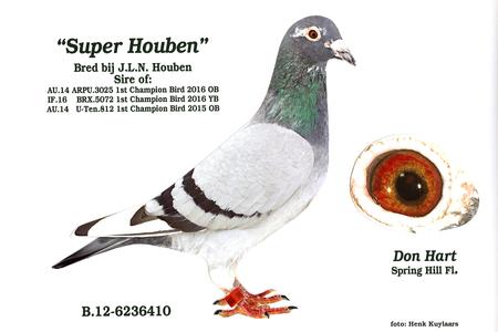 SIRE: Belg-12-6236410 BB Pied Wft Cock "CARL" SIRE TO "CINDY"AU-14-UTEN-812 1st NAT. ACE PIGEON OB RACING PIGEON DIGEST AWARDS ,won in 2015 oldbirds 1st Champion bird.1st Alachua 347 b.e1st Lake City 265 b e1st Lake City 246 b. e1st Jasper 178 b. 2nd Jasper 238 b. 8th Lake City 238 b. 15th Alachua 321 b., 27th Alachua 330 b., 31st Lake City 516 b., 51st Alachua 520 b. 1st CHAMPION BIRD OLD BIRDS 2015 UNITE TEN" SIRE TO " NADIA" & " EVELIEN" GrSon of "JACK DANIELS", "ELECTRA", "ELMER" & "FIRST LADY" BRED BY LUC HOUBEN
